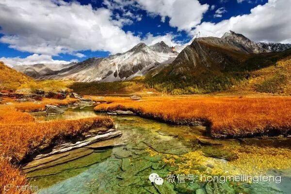 雪山之下的森林由单一的绿色变成深绿与金黄相间,深绿的是不落叶的云杉和冷杉,金黄色的是红杉与山杨,还有各种铁桦槭的颜色是艳丽的红色,像火一样。对于摄影爱好者来说,层次分明色彩多样的亚丁秋景,是最好的取景地。