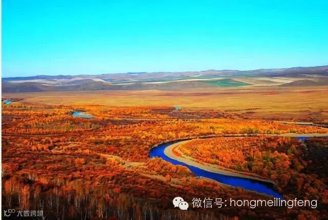 阿尔山地区草原和林海相接,雪山和温泉共存。每年9月初,一场秋雨过后,原本蓬勃翠绿的原野变得斑驳陆离,金黄的树叶在蓝天映衬下构成难得的秋日美景。