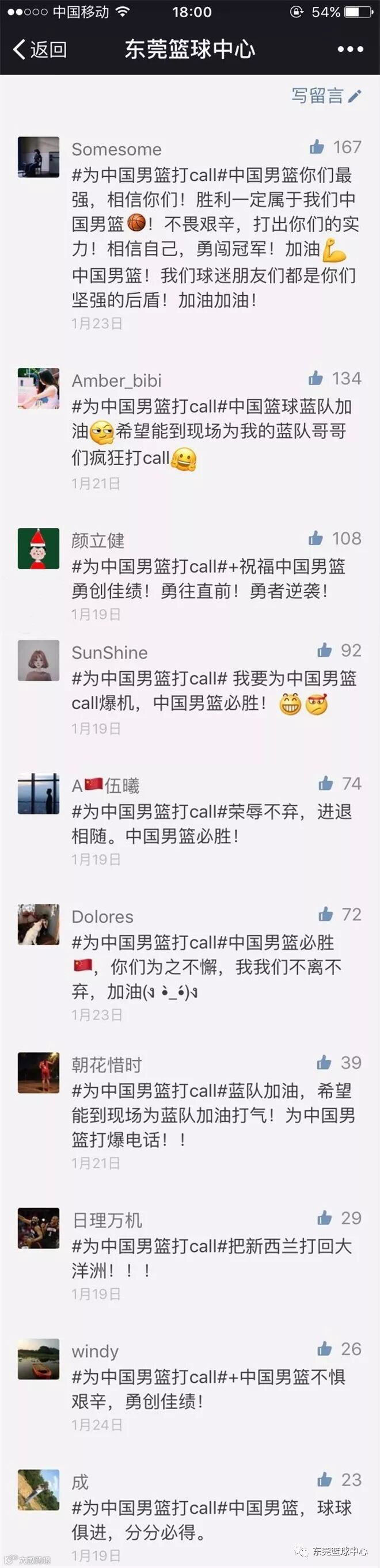 2019年男篮世界杯亚洲区预选赛中国VS新西兰于2月23日在东莞篮球中心(东风日产文体中心)开打,中国男篮将派出杜锋指导率领的蓝队出战。赛事承办方东莞市东世宏实业发展有限公司于1月21日在“东莞篮球中心”微信公众号推出#为中国男篮打call#行动,活动截止于2月1日18时,恭喜如下10名球迷获得每人2张中国VS新西兰比赛门票