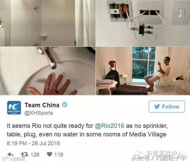 用着用着水池竟然掉了....床睡着感觉也很有可能崩塌...房间里没有电.... 巴西奥组委表示他们已经竭尽全力找维修公司在抢修了,几乎把全里约的维修工人都找来了,不过很多国家代表队都已经自己掏钱请人来修. 吸取了其他国家的教训.... 机智的英国队,这次出征干脆直接带上了一个水管维修工... 以防英国队员的宿舍出现任何状况.... “比如一些队员洗澡的时候可能水会很凉,这些我们都做好了准备”
