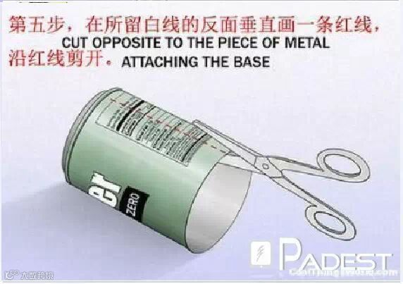第五步、在所留白线的反面垂直画一条红线,沿红线剪开(增强无线信号就快要大功告成了,不要前功尽弃啊)