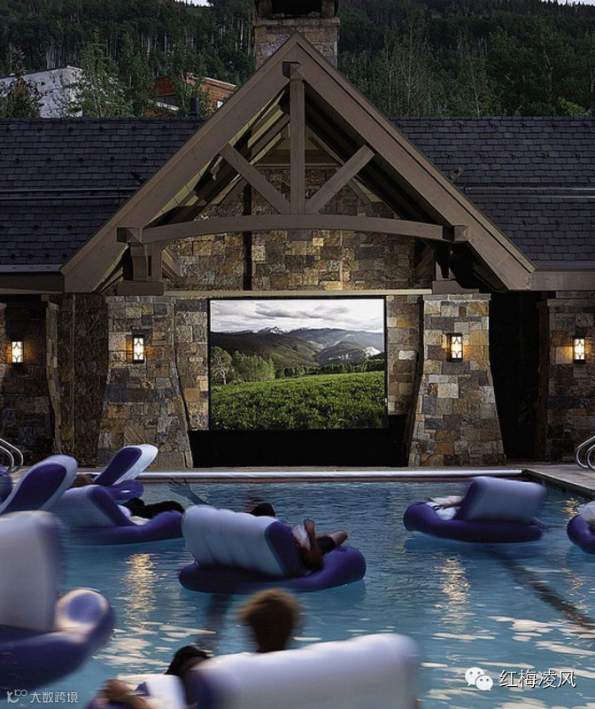 漂浮在泳池电影院中。