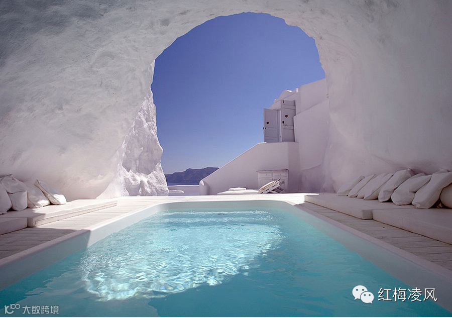 在希腊圣托里尼岛,徜徉在洞穴泳池中。