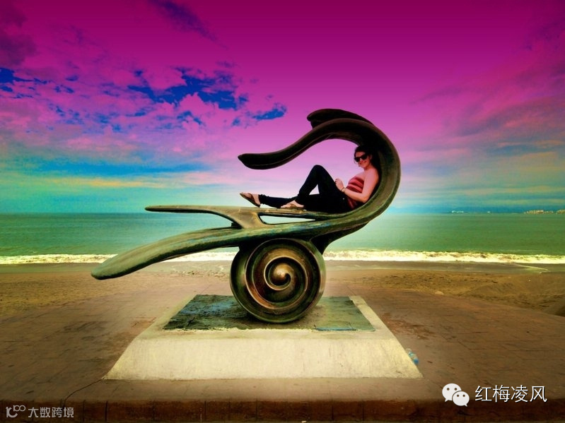 在墨西哥Puerto Vallarto,坐在沙滩雕塑中