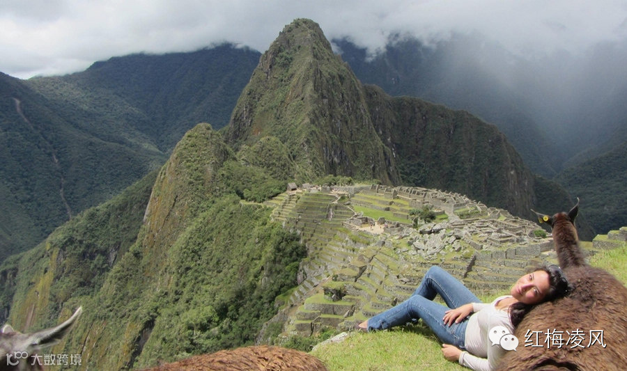 在马丘比丘,背靠美洲驼。