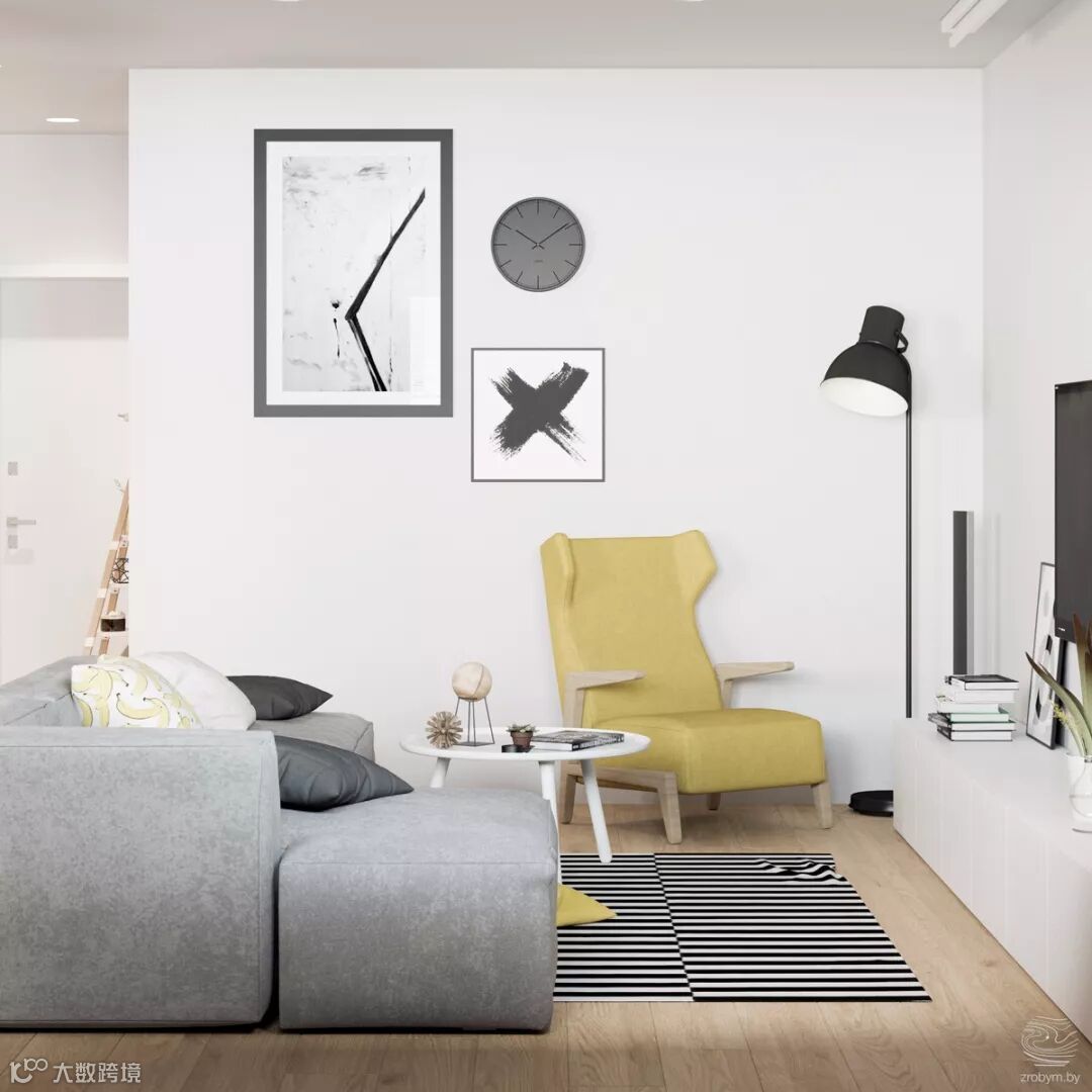 客厅:灰色基础款沙发,黑白条纹地毯。白色储物柜、黄色单人沙发,靠包,黑色落地灯装饰画黑白为主。