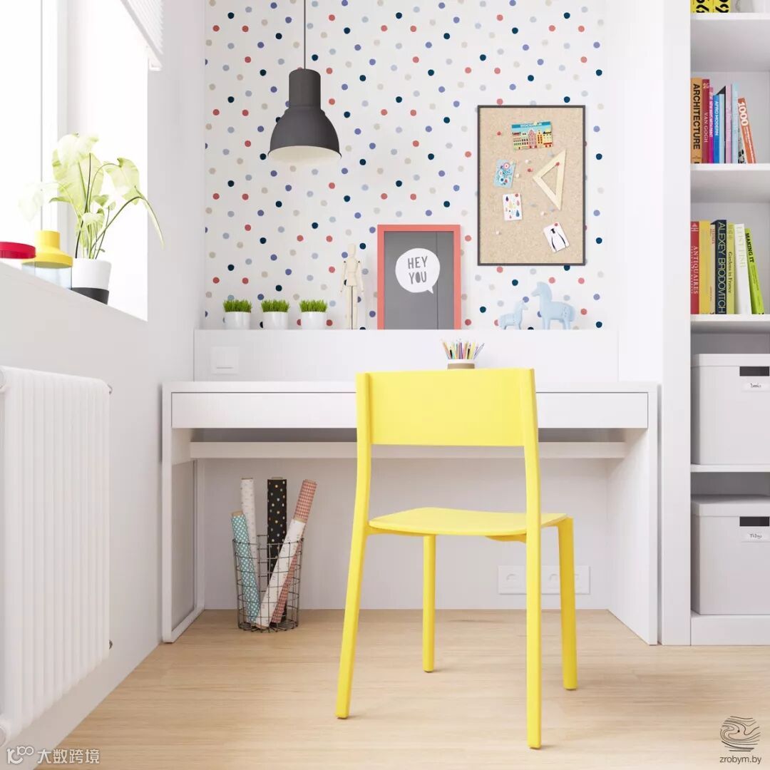 白桌,白色柜子,黄色塑胶椅子。配上装饰画,迷你绿植。