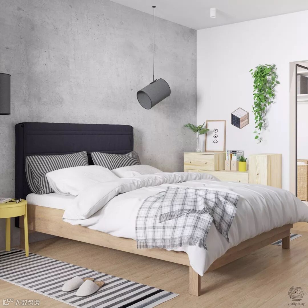 我是原木色床与小储物柜。装饰画两件,绿植垂墙。一小块条纹地毯,灰色简约灯饰。