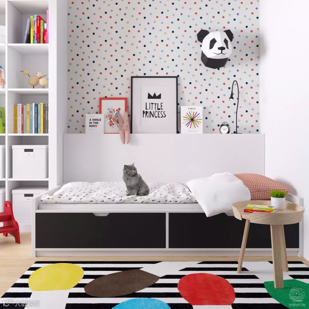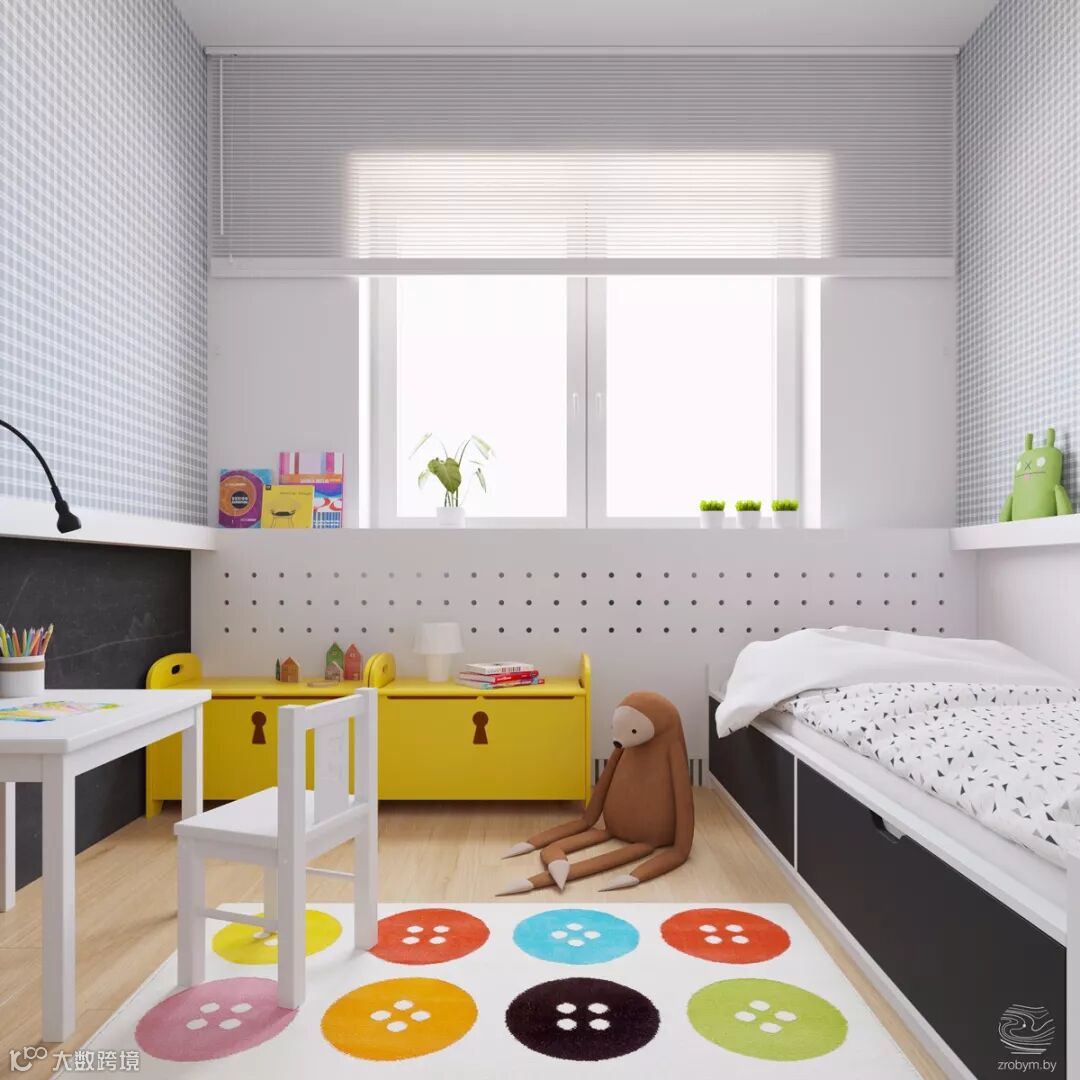 儿童房的床侧面抽屉也使用了黑色板材与地毯呼应。黄色小储物柜,白色护墙板。彩色纽扣地毯。一个儿童房基本完成。