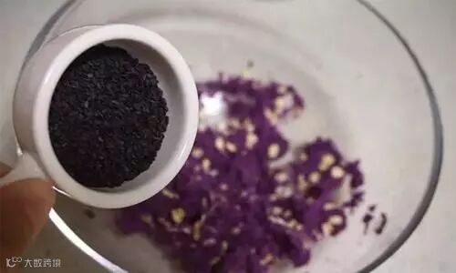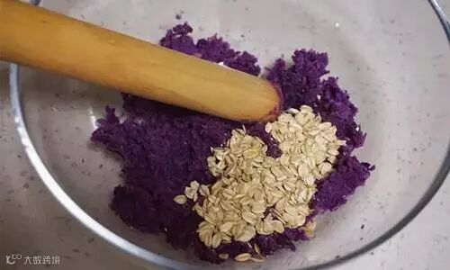 2、擀面杖来捣碎紫薯块,加入20克的燕麦,再放入10克黑芝麻,慢慢混合均匀。