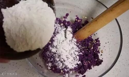 3、40克的面粉,不要一起放入,倒入一部分和紫薯一起揉匀,再加入剩余的。