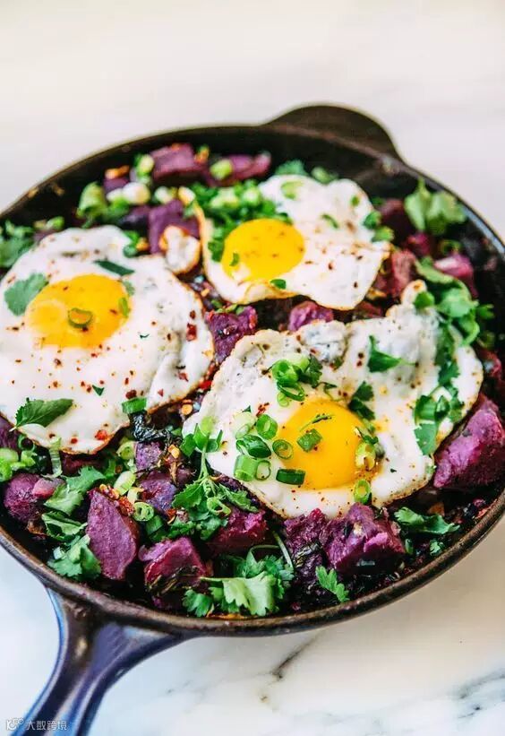 第五步:将紫薯、甘蓝、洋葱盛入平底锅或盘中,放入煎好的鸡蛋,加入切好的香菜叶和葱花装饰