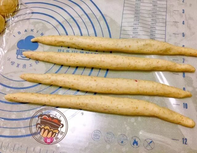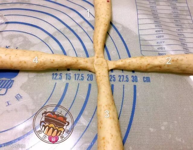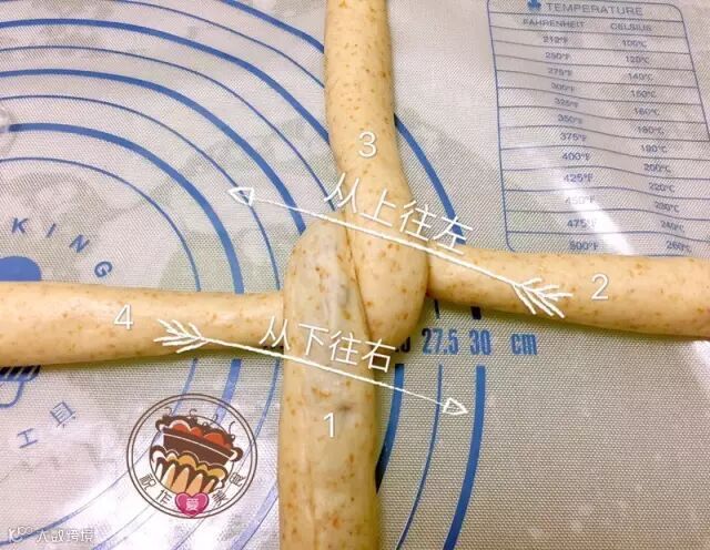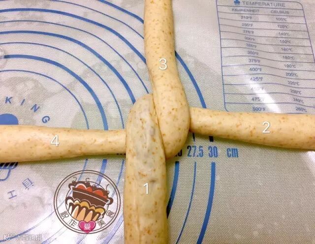 7.将第二次醒好面的面团搓长,开始整形。如下图一样将长条面团摆放好,四股辫,1下3上,然后2上左,4下右。一直这样重复,最后捏紧收口。