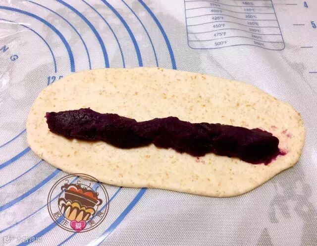5.将醒好面的小面团擀制成椭圆形,包入紫薯馅,收口向下,两头略尖。