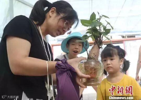 一游客母亲捧着无土栽培地瓜盆景向孩子进行农业科普教育。 黄水林摄