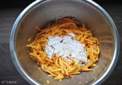 5、搅拌均匀的红薯丝的状态如图,不干也不是很湿,放入一旁静置10分钟。