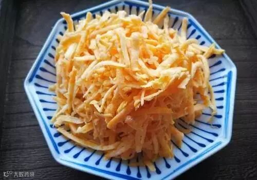 2、用擦丝器擦成细丝。如果没有擦丝器用刀切也可以,但是要切得细一点,这样比较容易熟。