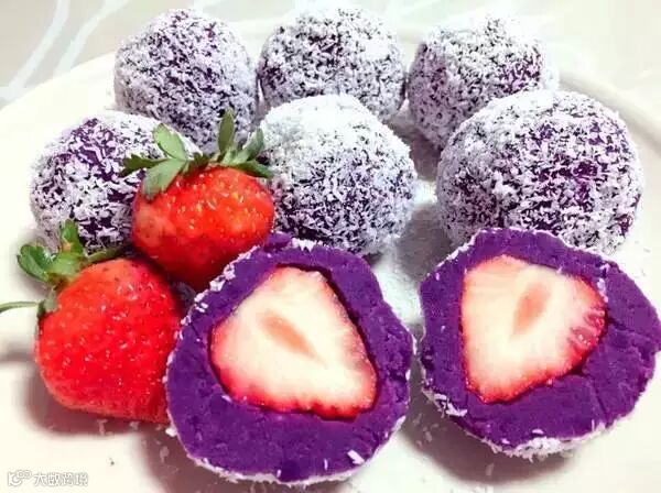 4、取一份紫薯包住草莓,在表面粘上椰蓉就好了