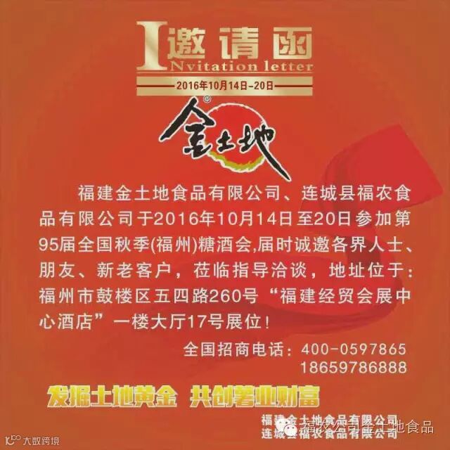 导读:倒计时1天!!金土地食品福农公司于2016年10月14日至20日参加第95届全国秋季(福州)糖酒会,届时