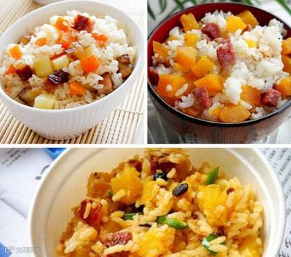 首先,自然是准备好三大食材,红薯、腊肠及米(米提前泡一会儿),滴上一两滴芝麻油拌均,加入盐与冷水,倒入电饭煲中煲好后焖上十五分钟左右,有没有觉得美味也不是那么难?
