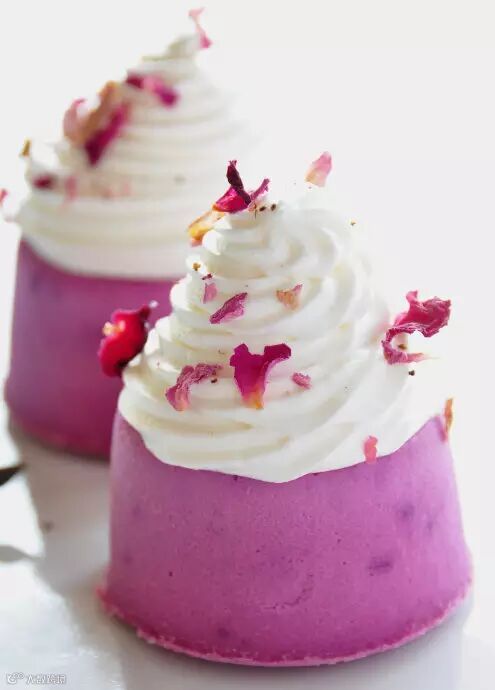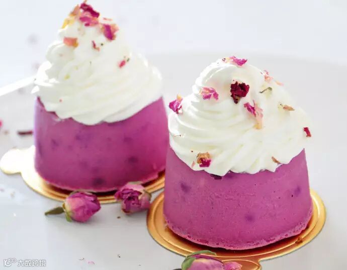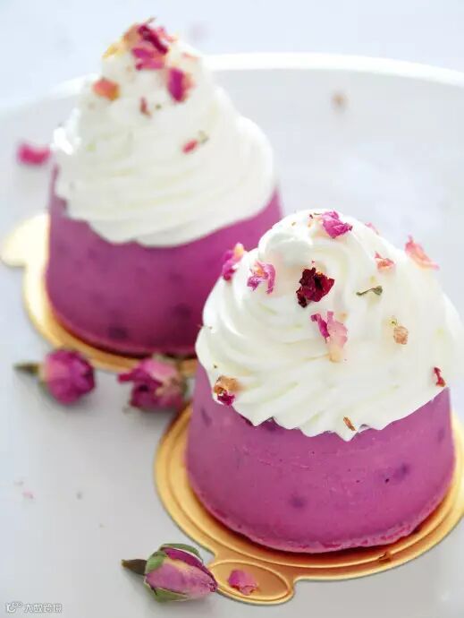 把冰凉的淡奶油,白糖,香草精一起混合打发,然后挤在冷藏后的紫薯芝士蛋糕上,撒上干玫瑰花瓣即可。