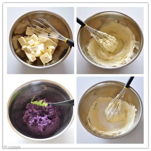 1.奶油奶酪切块,室温软化。紫薯泥碾烂备用。