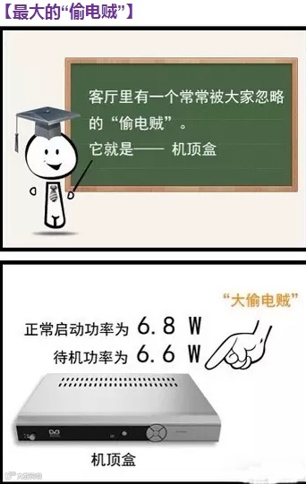 是它,是它,就是它!最大的偷电贼在这:电视机顶盒↑↑↑待机功率竟然跟正常启动功率差不多!赶紧行动,关机后记得拔插头哦~