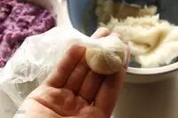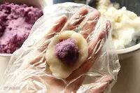9、纯紫薯的薯球,取少许紫薯馅放在手中,按以上方法操作即可