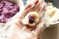5、待冰皮变温不烫手,取一只保鲜袋套在手上,抓取少许捏扁