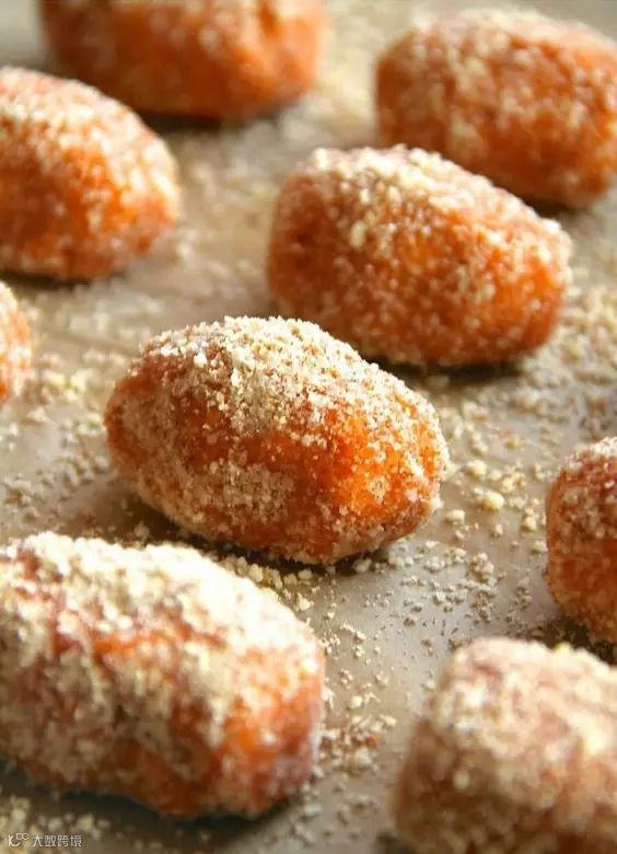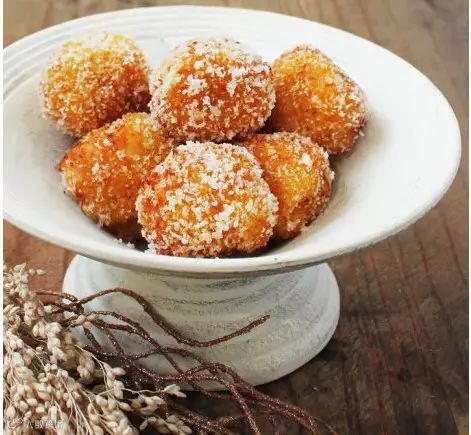 步骤四:做好的丸子撒上椰蓉,入油锅炸熟即可!