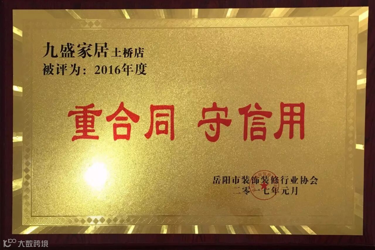 作为家居新势力卖场而言,在诚信经营方面,我们信守“以真诚之心,行信义之事”。正于今年,九盛家居土桥店(土桥新九盛)获得岳阳市装饰装修行业协会首度认可。