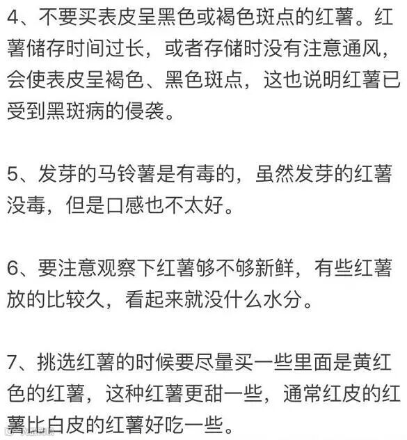 3、选红薯时要闻一下有没有霉味,发霉的红薯含酮毒素,不可食用。