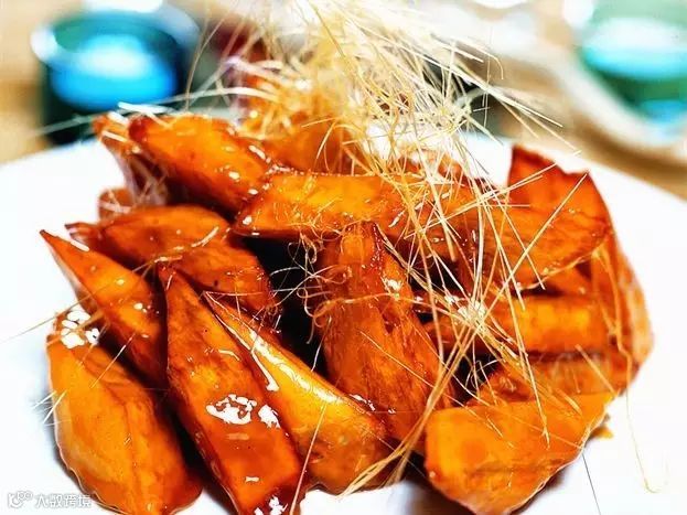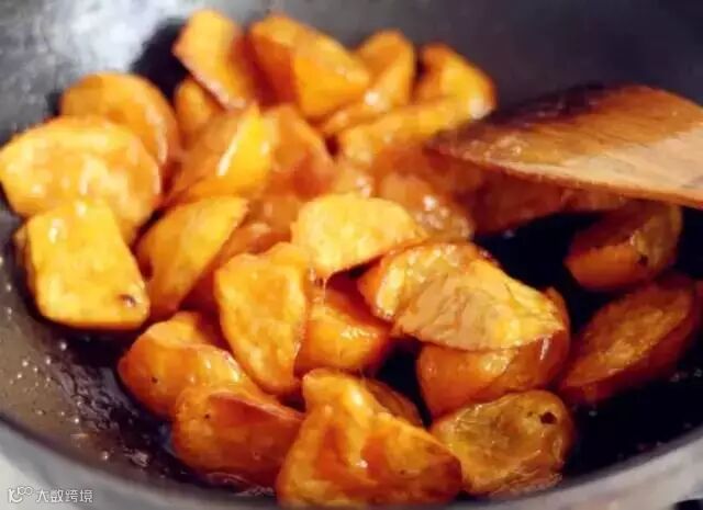 6.把炸过的地瓜倒入融化的糖中,快速的以筷子翻动使之均匀沾到糖浆,放在防沾纸上放凉(或盘子抺油),表面会形成一层糖衣,洒一些黑白芝麻装饰即可上桌