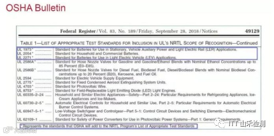 为促进移动设备行业的健康发展,保护人们的生命和财产安全,隶属于美国劳工部的联邦政府管理机构—OSHA (Occupational Safety and Health Administration美国职业安全与健康管理局)明确要求直接对电池系统进行检测,并通过相关电池认证标准。美国OSHA标准是在美国司法权利管理范围内推行的职业安全与健康标准,其丰富的安全健康文化内容、严谨的安全管理哲学和科学经济的安全管理办法不仅得到了美国社会各行业的高度认可,也得到了世界的广泛推崇。