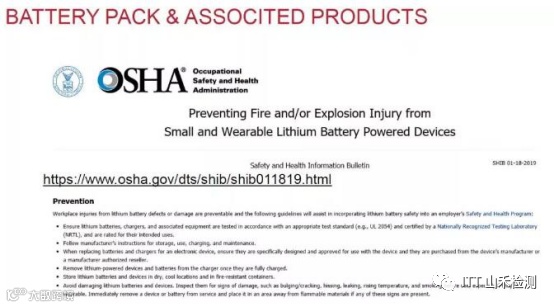 自2018年9月28日,UL 2271、UL1973、UL2054等多项针对电池系统的标准被纳入OSHA管控范围后,OSHA在官网等资讯平台多次强调,雇主/企业要确保在工作场所中使用的锂电池产品相关设备应按照相对应的标准检测认证,包括独立于设备的电池和安装在设备中的电池。若有任何美国雇主将未取得相应NRTL认证的电池或电池驱动产品,用于工作场所,则视为违反OSHA法规规定,并承担相应责任。而雇员如果怀疑雇主没有遵守OSHA的规定,雇员有权利进行举报,充分体现了美国政府对于锂电池风险的高度关注。