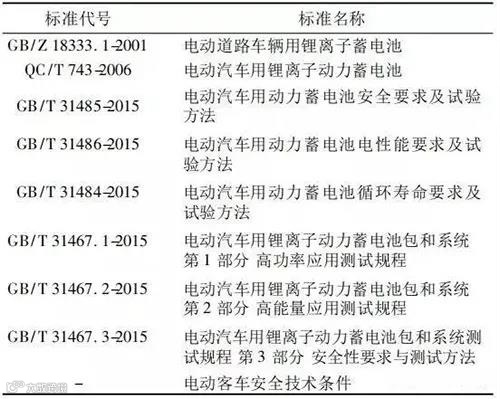 2015年,国家标准化管理委员会颁布了一系列标准,GB/T 31484-2015《电动汽车用动力蓄电池循环寿命要求及试验方法》、GB/T31485-2015《电动汽车用动力蓄电池安全要求及试验方法》、GB/T 31486-2015《电动汽车用动力蓄电池电性能要求及试验方法》及 GB/T 31467. 1-2015《电动汽车用锂离子动力蓄电池包和系统 第1部分高功率应用测试规程、GB/T 31467. 2-2015《电动汽车用锂离子动力蓄电池包和系统 第2部分 高能量应用测试规程、GB/T 31467. 3《电动汽车用锂离子动力蓄电池系统测试规程第3部分 安全性要求与测试方法。