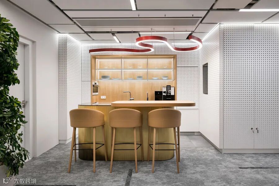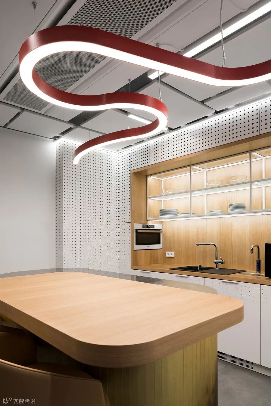 办公区域内部其他部分也使用了红色落地灯,来解决线性吸顶灯可能造成的光源不足的问题。当设计理念被肯定,这些造型独特,形状各异的红色轮廓灯也成为了REAKTOR工作室的闪亮标志。