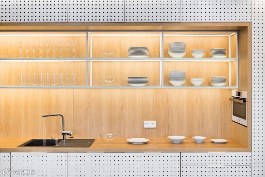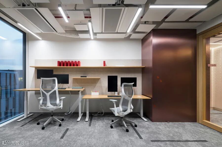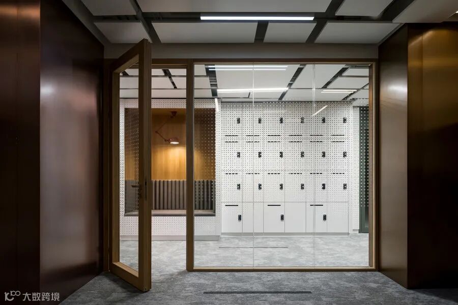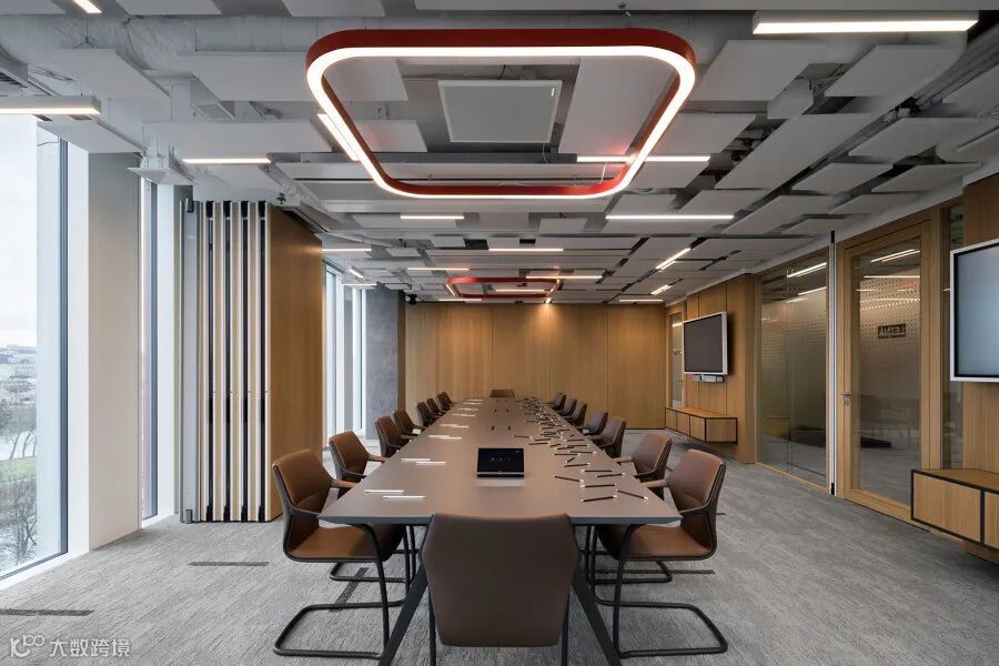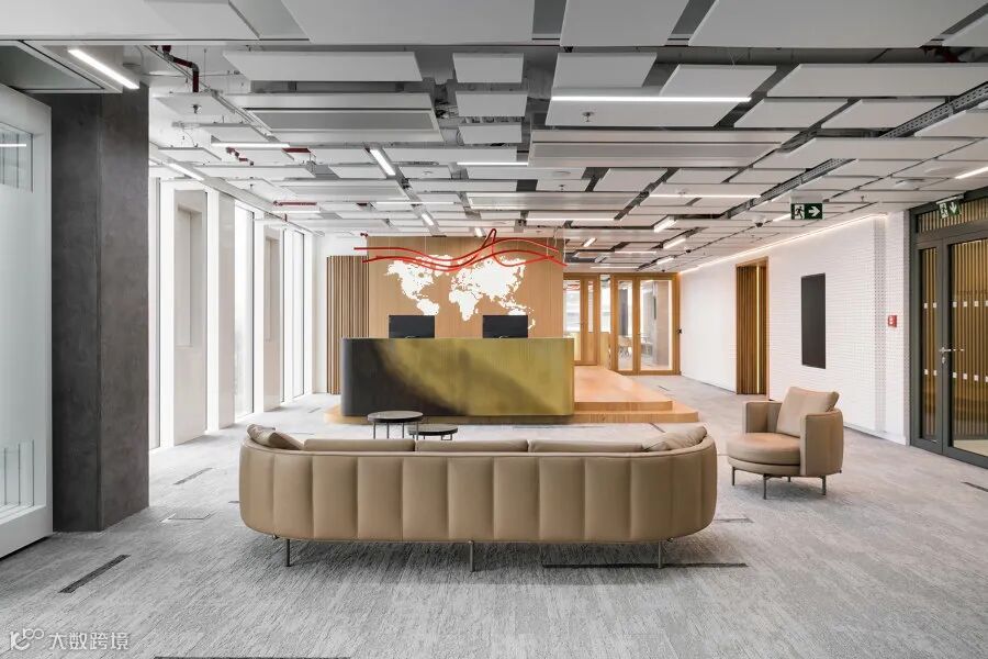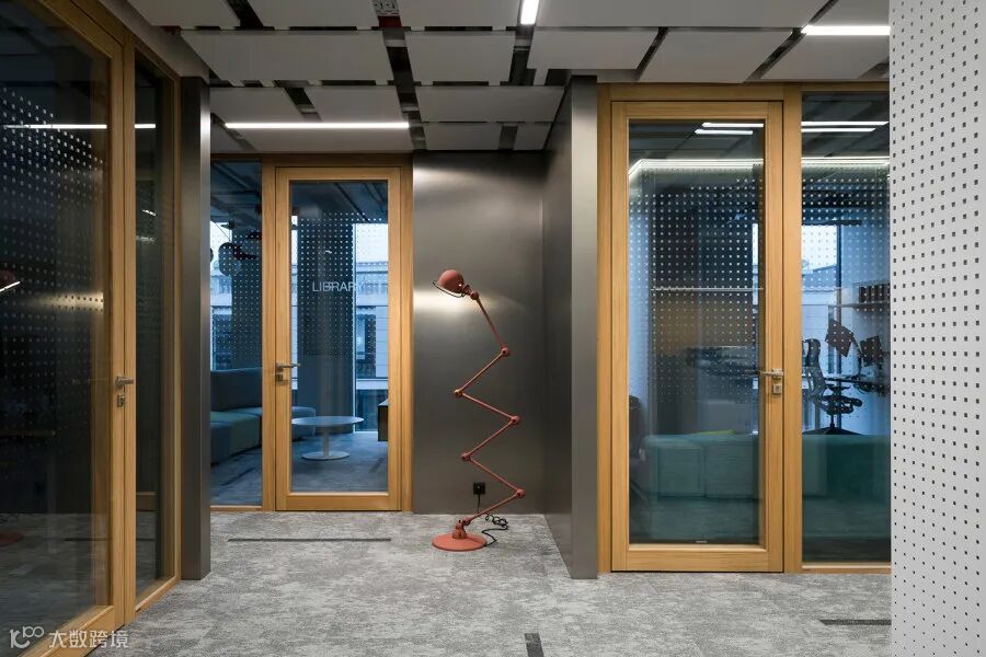 办公区的室内分区概念反映在建筑立面上。客户区域几乎占据了大楼的两层。办公室区域层被隔板垂直分开。然后,靠墙放置的桌子与金属柜保持在一个水平面。私人图书馆、会议室群、露台和开放式办公空间占据了整层空间的四个角落,而中间部分则被划分为几个独立办公室。