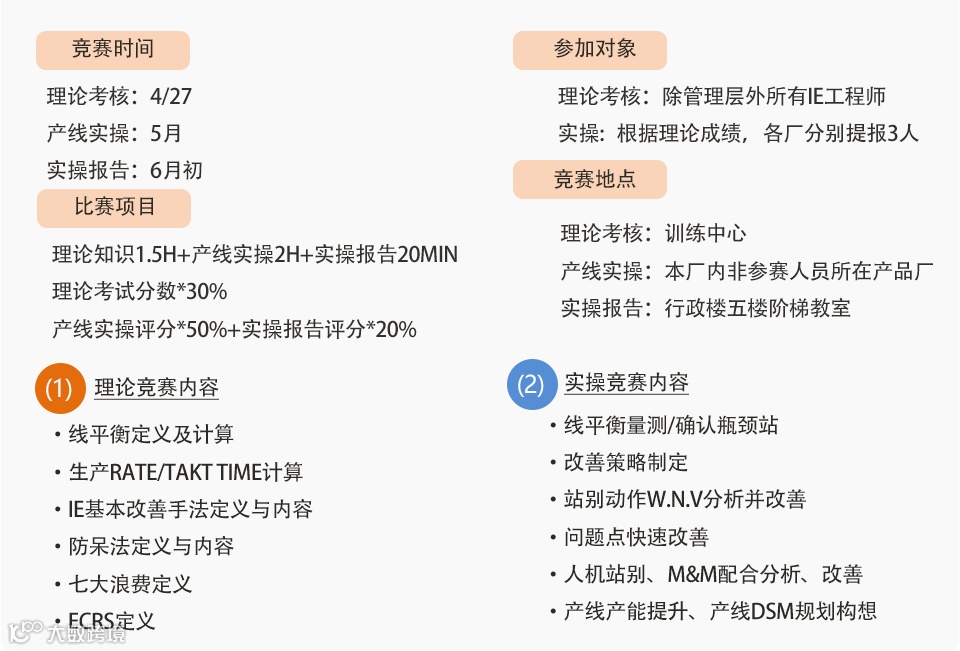 “如切如磋,如琢如磨”,精于工艺,精益创新是IE工程师的核心品质!为持续提升IE能力,检验IE技能水平,提升学员规划、改善、优化制程等能力,助力提升产能 ,生技-IE职系将在4-6月开展2022年度技能竞赛!本次竞赛围绕测量线平衡、确认瓶颈站、制定改善策略、构想产线DSM规划等几个方面进行角逐!