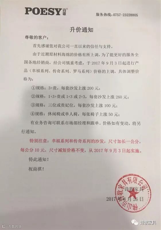 导读:首先感谢全国经销商们对我公司一直以来的信任与支持。由于近期原材料海绵的价格有所上调,为了能更好的服务全国各地经销商,经公司慎重考虑,于2017年9月3日起进行产品(幸福系列、传奇系列、罗马系列)价格的