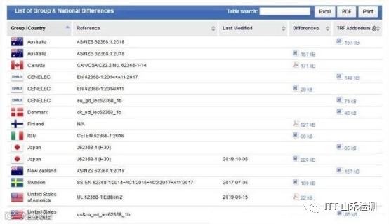 IEC国际电工委员会TC 108在2018年10月04日正式发布了第3版IEC62368-1:2018 Edition 3.0。 (备注:因为目前只有美国和加拿大,针对IEC 62368-1第3版公布了国家差异,所以在做CB认证时,第3版无法用于其他国家的转证,而IEC 62368-1第2版已经有部分国家公布了国家差异,所以IEC 62368-1第2版的CB是可以在这些国家转证的,国家差异列表见下图。)