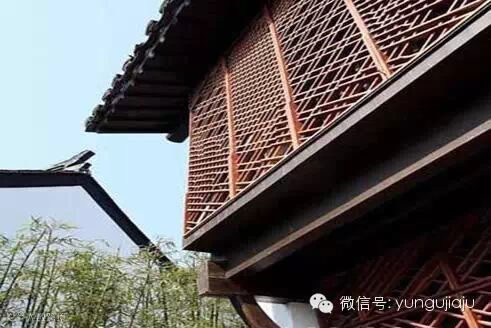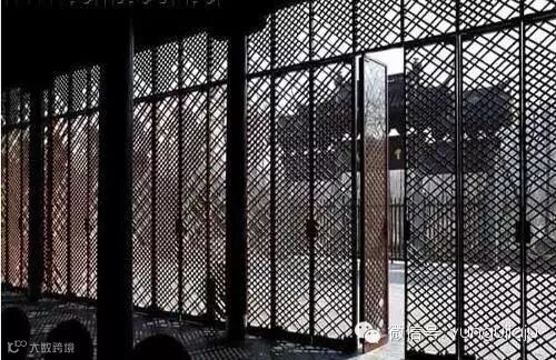 我们注意到仿古建筑的正反立面,艾未未显然是运用了现代菱形的平面设计(即网状)作为仿古建筑的立面,从建筑外观上看仅保留了黑瓦和墙体的白色。只看照片很难引起共鸣,若亲临现场你就会发现现代元素的菱形网状图案取代了传统的花窗。当阳光穿过菱形网状的瞬间,无数条等量壮观的光线密集地映照在地面,随后随着时间的变化,光线又漂移在墙上,那种光和影的神奇给人一种生机勃勃、万物复苏的律动感。尤其是从里往外透视时,阳光下的人世间居然被艾未未设置的现代版的花窗“过滤”了。是过滤了阳光的强度?还是“粉饰”了阳光温暖?还是内心世界通往外界做“掩饰”的一 道“屏障”?透过菱形网状“窥视”阳光下的东西,或许只有在现场才能获得身临其境的感受。这种智者见智、仁者见仁的观点一直关注微信swdtbao反映艾未未的设计中。为加强“老宅”的密封、隔音和隔热,艾未未在菱形网状背后设置固定的中空玻璃落地窗,落地窗与菱形网状之间除门外一律封死。艾未未考虑的是西湖的美景和周围的天然景色不一定非要打开门窗才能欣赏,或许从过滤另一扇门窗的角度去看更有味道;而甲方则考虑更多的是你要方便我们日后的日常保养和维修,笔者曾去现场观摩时,发现工人们正在修改和完善艾未未的得意之笔……