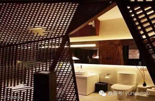 然而“仿古新做”的观念最终强势还是覆盖了业主内心的期待。这并非否认艾未未的“仿古新做”。能不能客观的体现江南会所的过去、现在和未来?从设计学术角度上讲,从时间成本上讲,实际上很难控制。有时候艺术家的思维是一气呵成的,就像艾未未常说的那样:“当发现石头从山上往下滚动时,为时已晚”。以艾未未的修养和功底,他想将江南会所打造一个富有时代感的现代时尚中式风格会所,我们从他设计的钢板楼梯及工业柳钉及舰船防滑钢地板踏步的设计思路上也找到了“仿古新做”的逻辑。企业家之所以能成功而成为商业巨子,这和企业家钢铁般的意志的锤炼是否有某种“暗合”,还是处于对仿古空间注入钢木软硬对比的操控考虑?这仅仅是心里“考证”。为减弱钢板对老宅木结构的冲突,艾未未在钢板上用了黑白二种颜色。白色——显然是在仿古建筑时空里保留“老宅”黑瓦白墙的传统本色;黑色——显然是协调楼梯的垂直通道气场仿中式老家具气息的关系。我们还注意到艾未未眼里的酒吧台及酒柜,前者“貌不惊人”,后者屏住气息——骨架结构是中式的,颜色则很时尚的白色,这种用时尚元素去“反串”传统的混搭风格颇有新意……在白色酒吧间、欧式古典的椅子和桌子却被艾未未改改成了中式的红木色彩,这种“形同”而“意”不同的手法用欧式古典形象去反串中式红木家具所产生的变化气息就颇有味道。另外卫生间的几何型门窗造型不仅在视觉上强化了空间的构成,还在空间隔断的运动走向上格外有张力,并打破了空间的横平竖直秩序而一跃成为无象无形的小试身手。透过无象无形的几何型小方格隔断,卫生间横平竖直的构成暖色空间像罩上了一层结实粗狂的渔网,倘若要从里面“逃生”的话,足够让你待在卫生间思索半天。像这类象征性,寓意性、趣味性和联想性的设计语言在江南会还很多细节。