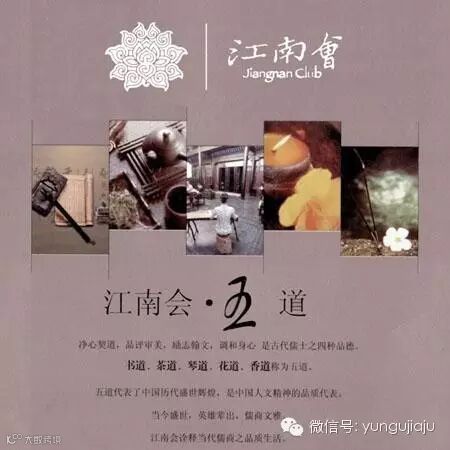 江南会“五道”:是为书道、茶道、琴道、花道、香道,乃江南会崇尚并奉行之道。江南会认为,五道代表了中国历代盛世辉煌,是中国人文精神的品质代表。