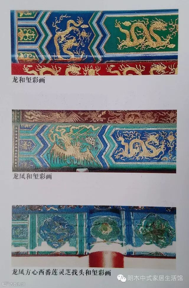 根据和玺彩画细部纹饰运用的不同,大体分为:龙和玺、龙凤和玺、龙凤方心西番莲灵芝找头和玺、龙草和玺、凤和玺、梵文龙和玺等六种不同等级的和玺彩画。