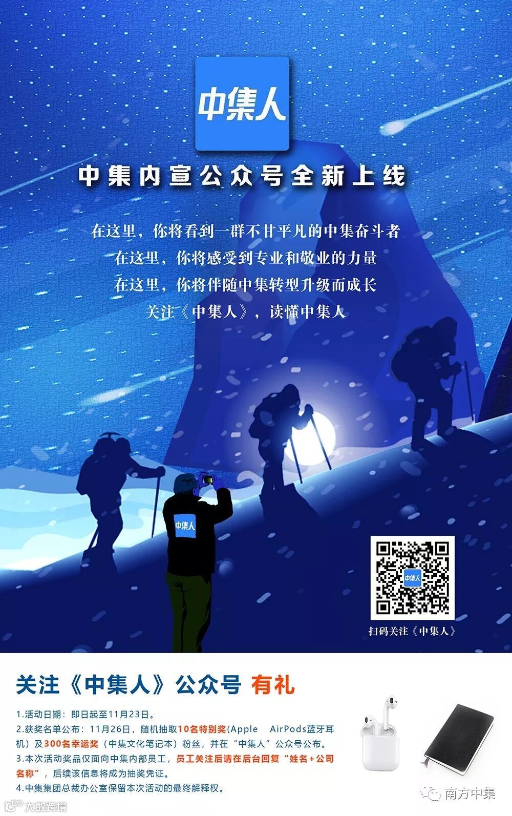 2、获奖名单公布:11月26日,随机抽取10名特别奖(Apple AirPods蓝牙耳机)及300名幸运奖(中集文化笔记本)粉丝,并在《中集人》公众号公布。