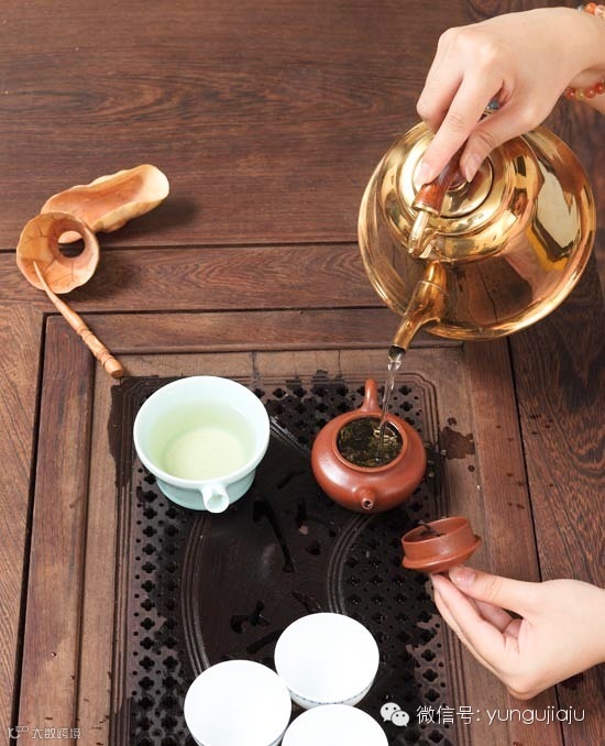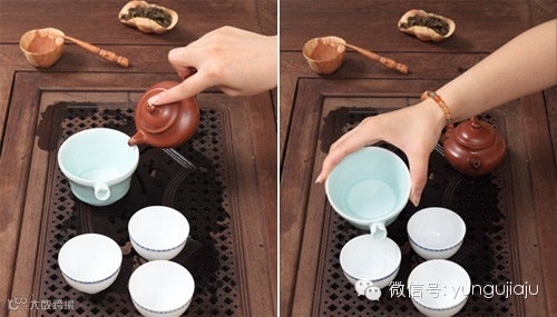 把沸水再次倒入壶中,倒水过程中壶嘴“点头”三次,别一次把壶倒满,茶道的程序其实也只是好看而已,只有这步才是平时大家常用的,表演上有即所谓“凤凰三点头”,向客人示敬。