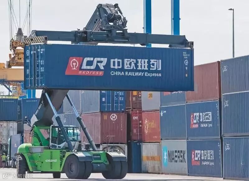德国杜伊斯堡DIT货运场站内,工人操作机械搬运中集集团制造的中欧班列集装箱。近年来,中集集团根据中欧班列客户需求,研发制造了一系列“特种集装箱”,实现全品类物品的运输。