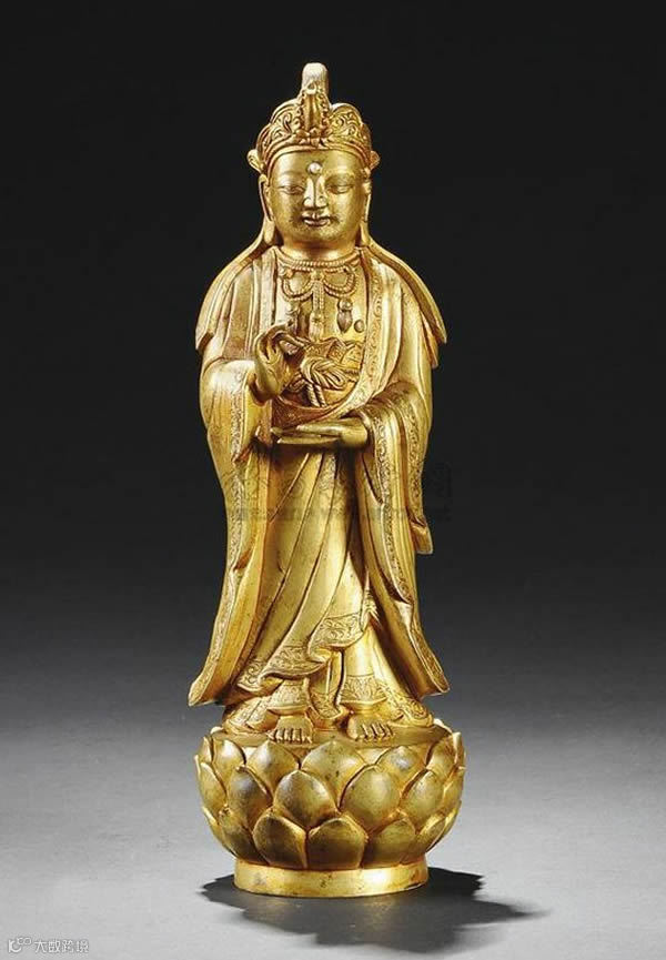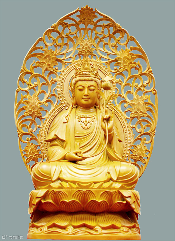大势至菩萨的形象一般为:头顶宝瓶,手执莲花。