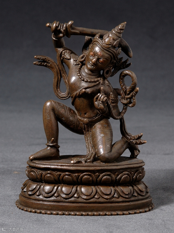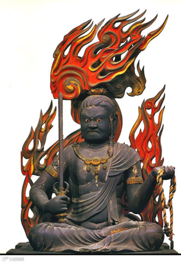 不动尊菩萨形象为:怒目圆睁,右手持剑,左手提绢索。